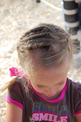 I'm afraid of up 'dos because they always fall out after about 30 min to an hour. This one didn't. I looooooved it, too, because it was so cute. I just parted her hair in three horizontal sections, ear to ear, and french braided across, braiding down to the ends. Then I twisted the three braids together and into a bun, securing it with a rubber band. Added a fluffy hair tie, and voila! Easy peasy and stayed all day. This is a simplified version of this 'do. I really had fun with the "Frenchbraids with Flair" series she was doing.